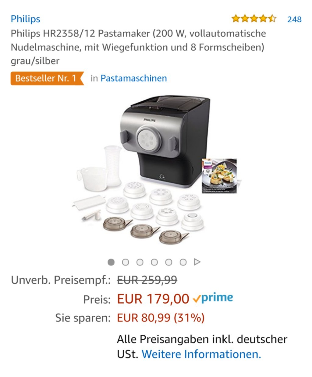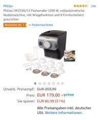 Bei Saturn gibt es die Nudelmaschine von PHILIPS HR 2358/12 13-tlg für 179€. Im Idealo preisvergleich fallen hierfür 215€ an.