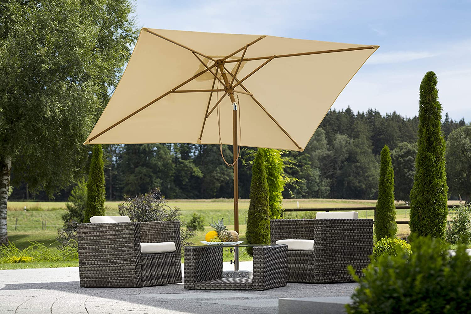 Zum Beispiel den Schneider Malaga Sonnenschirm, rechteckig, sand, 300x200cm gibt es für 87,49€ mit einer Ersparnis von 38€ zum Vergleichspreis auf Idealo. Das Teil sieht edel aus, auch die Kunststoffteile wie z.B. die Krone und der Schieber sind in Holzoptik.