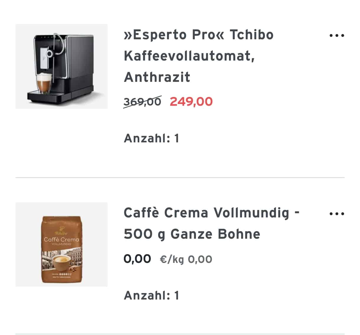 Heute bei Tchibo ist der Esperto Pro Kaffeevollautomat (Anthrazit) für 249€ inkl. Versand erhältlich. Eventuell muss der Gutschein XMAS23 eingesetzt werden. Im Onlineshop bekommt ihr automatisch 500g Café Crema vollmundig (ganze Bohnen) mit in den Warenkorb gelegt. Der Kaffeevollautomat ist heute auch in den Filialen zum gleichen Preis erhältlich.
