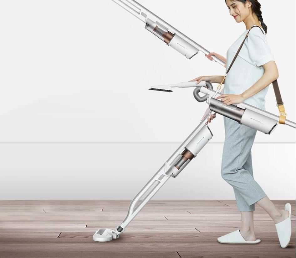 Mit dem Tragegurt zum Umhängen haben Sie mit dem Deerma DX800S Staubsauger eine Hand beim Staubsaugen frei. Der Staubsauger mit ergonomischem Design in der Farbe Weiß hat ein Eigengewicht von 3,5 kg.