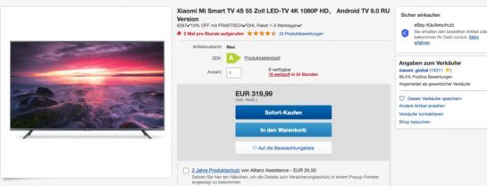 Bei ebay erhaltet ihr den Xiaomi Mi Smart TV 4S 55 Zoll LED-TV 4K 1080P HD für 319,99 € (inkl Versand). Der PVG beginnt ab 443,31 € (429 € zzgl Versand).
