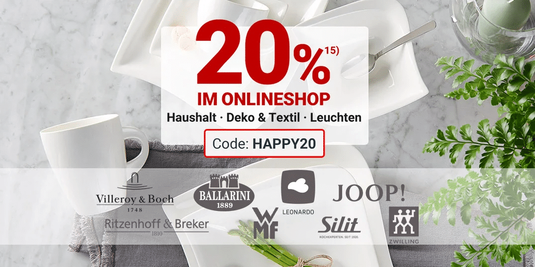 Der Gutscheincode HAPPY20 ist nur im Onlineshop gültig und einlösbar. Auch auf bereits reduzierte Artikel. Nicht gültig auf Artikel der Seite http://zurbrueggen.de/prospekt-werbung/. Nicht kombinierbar mit anderen Rabatt- und Tauschaktionen. Keine Verrechnung mit bereits getätigten Käufen. Ausgenommen sind Artikel der Marken KitchenAid und Le Creuset. Gilt nicht auf Bücher und Gutscheinkarten. Gültig vom 31.05. bis 03.06.2024.