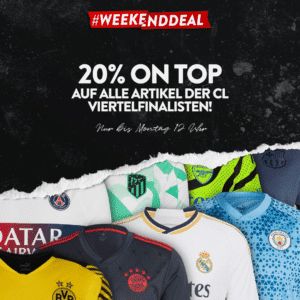 Bei Outfitter sind übers Wochenende alle Fanartikel der Champions League Viertelfinalisten um zusätzliche 20% ermäßigt.
