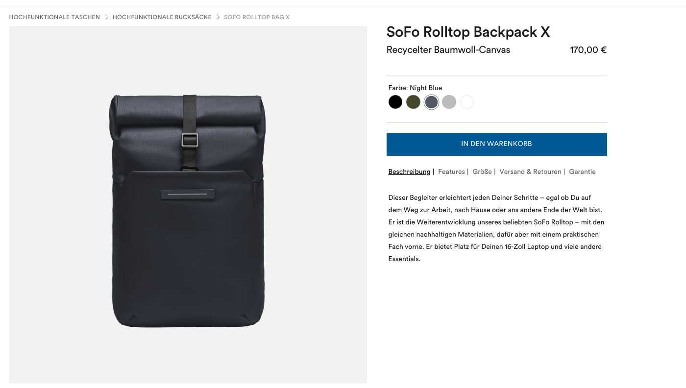 Als Beispiel für das Sparpotenzial: Der Sofo Rolltop Rucksack in Night Blue, der normalerweise für 170€ verkauft wird, kostet mit dem Rabatt 136€, was eine Ersparnis von 34€ bedeutet.