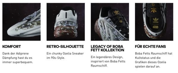 adidas ist ja aktuell in absoluter Gönnerlaune und spendiert euch richtig geile Preise mit dem 20% auf SALE Gutschein. Da kommt auch dieser – zugegeben, spezielle – Sneaker auf den Plan. Aber als Star Wars Fan muss man zumindest das Design schätzen. Boba Fett und seine Slave 1 sind mehr als legendär, auch schon oder erst recht vor der bescheidenen Disney+ Serie. Naja, der Sneaker ist auf jeden Fall ein cooles Sammlerstück, auch wenn es nicht meinen Schuhgeschmack trifft, was sagt ihr?