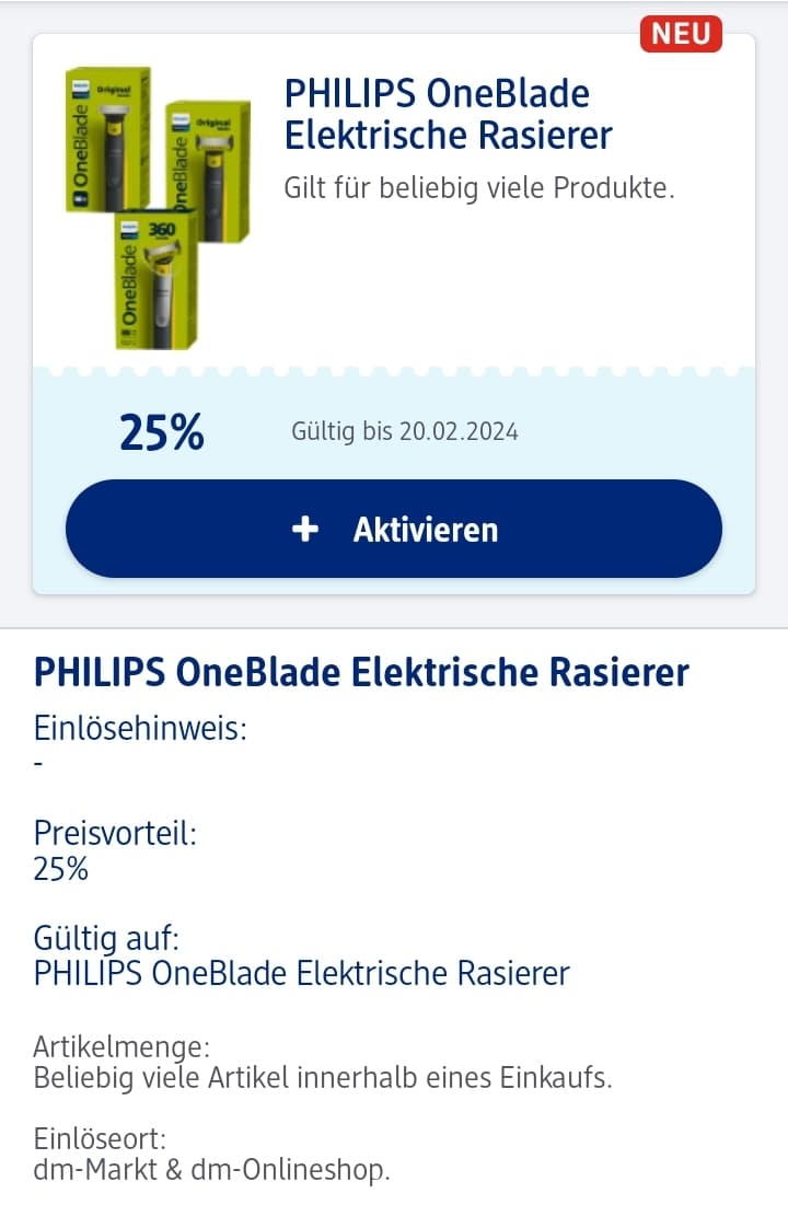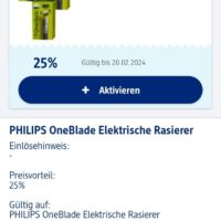 In der DM App gibt es jetzt 25% Rabatt auf verschiedene Philips OneBlade Rasierer.