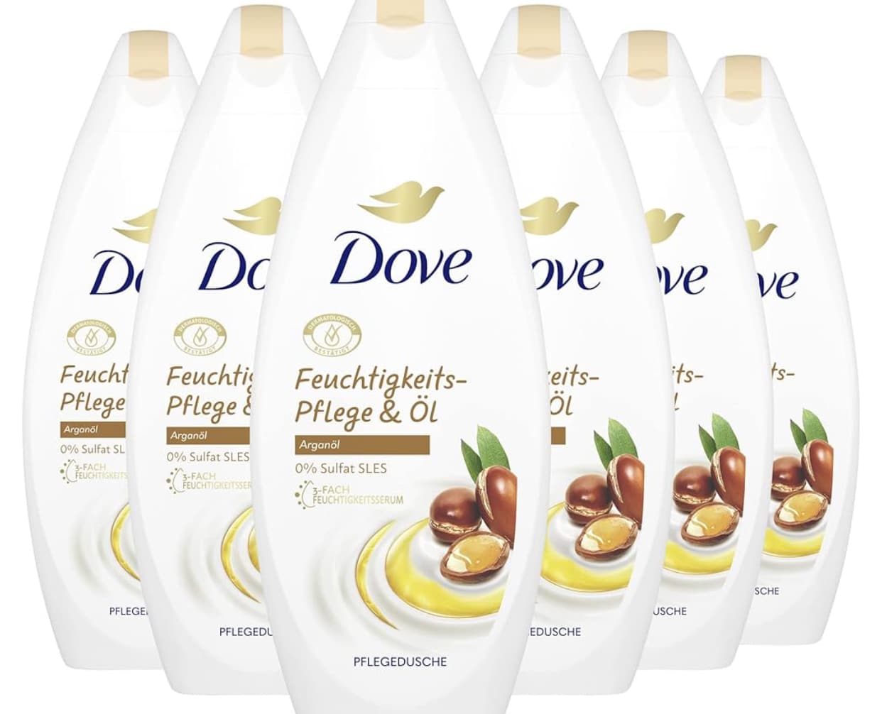 Dove Duschgel Feuchtigkeits-Pflege & Öl mit Arganöl und 3-fach Feuchtigkeitskomplex für trockene Haut 6x 250 ml für 9,94€
