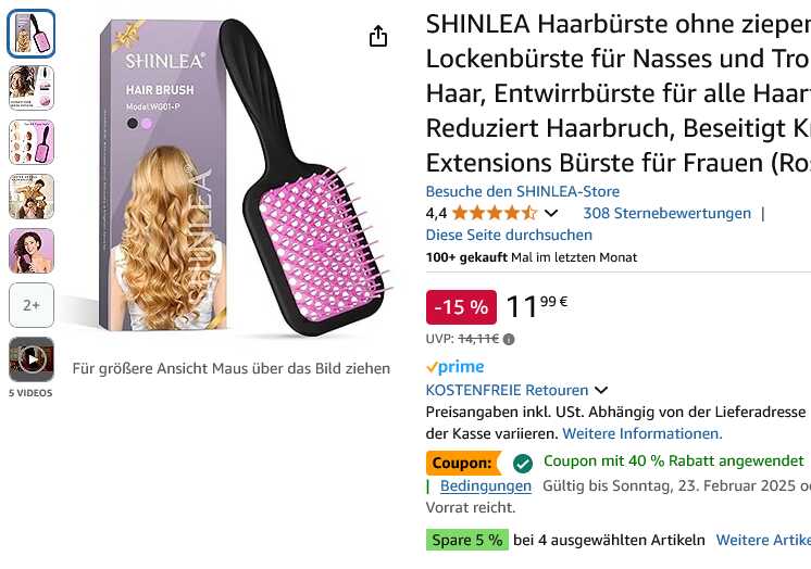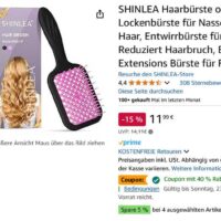 Amazon selbst verkauft momentan die SHINLEA Haarbürste ohne ziepen mit einem 40%-Coupon und damit zum Preis von nur 7,19€ mit Prime / an eine Abholstation. Der Normalpreis beträgt hier 11,99€ auch im Vergleich auf Idealo.
