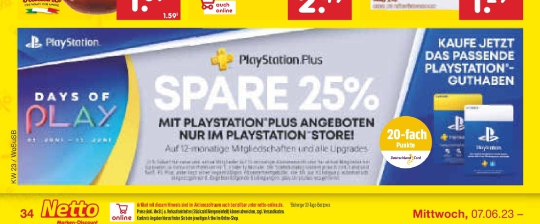 Ab 5.06. gibt es bei Netto 20 fach Deutschland Card Punkte auf PSN Guthaben. Natürlich nicht so billig wie manche Online Angebote aber wer sein Guthaben lieber altmodisch kauft aufjedenfall nicht schlecht :-).