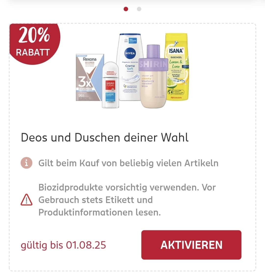 Gerade gibt es bei Rossmann alle Deos, Duschgels und Shampoos mit einem 20% Rabatt Code mit der App deutlich günstiger!