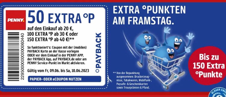 bei Penny bekommt ihr am Framstag 50 Extra Punkte ab einen Einkauf von 20€, 100 Extra Punkte ab 30€ oder 150 Extra Punkte ab 40€.