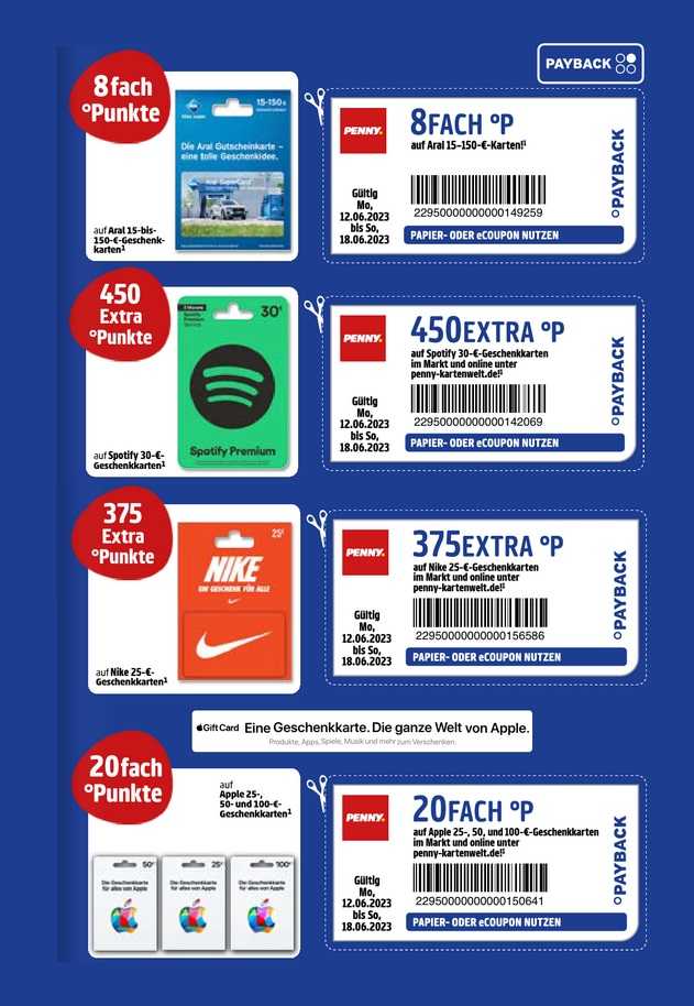Penny Kartenwelt – Mehrfach und Extra Paybackpunkte auf Aral, Nike, Sportify & Apple Geschenkkarten (12.06. – 18.06.23)