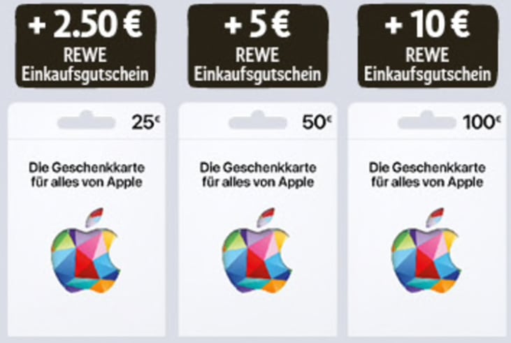 Bei Rewe erhaltet ihr im Markt oder in der Kartenwelt vom 24. Februar bis 2. März die Apple Geschenkkarten mit einem 10% Rewe Einkaufsgutschein (muss bis 30. März eingelöst werden)