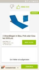 Praktisch für unterwegs: Ihr bekommt bei XXXLutz 2 Strandliegen für 14,92€ inkl. Versand. Wenn ihr euch zwei Artikel in den Warenkorb legt, den 10€ Gutschein aus der Newsletter Anmeldung nutzt und einen Füllartikel in den Warenkorb legt, kommt ihr auf den Preis. Als Füller eignet sich zum Beispiel dieses Weißweinglas für 0,99€ https://www.xxxlutz.de/p/homeware-weissweinglas-0068770024.