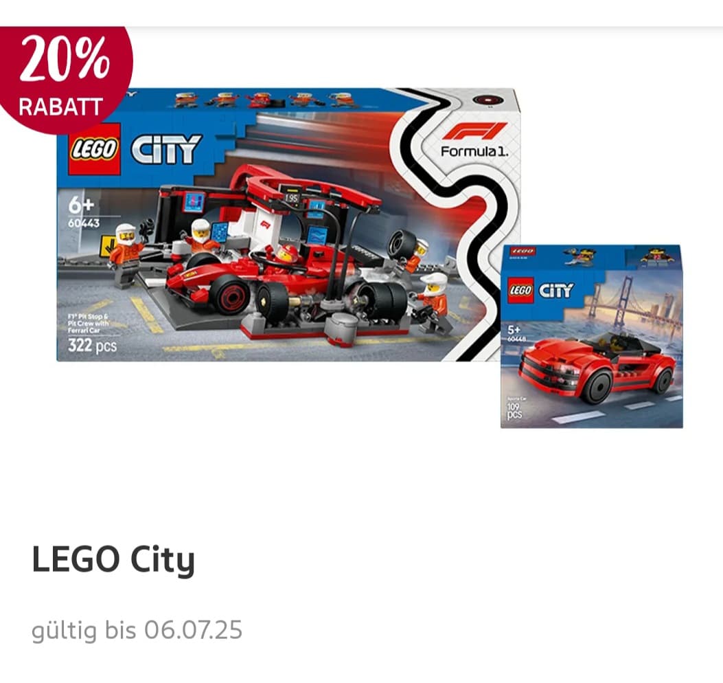 In der Rossmann App gibt es einen Coupon, mit dem ihr bis zum 06.07.2025 20% Rabatt auf Lego City Produkte erhaltet.