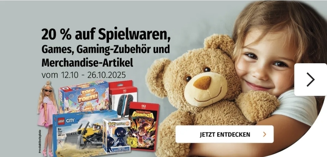 Müller hat wieder eine starke Aktion am Start: Vom 12. Oktober bis einschließlich 26. Oktober 2025 gibt es satte 20% Rabatt auf das gesamte Sortiment an Spielwaren, Videospielen, Gaming-Zubehör sowie Merchandise-Artikeln! Ob für den eigenen Bedarf oder schon als Vorbereitung auf Weihnachten – hier könnt ihr ordentlich sparen!