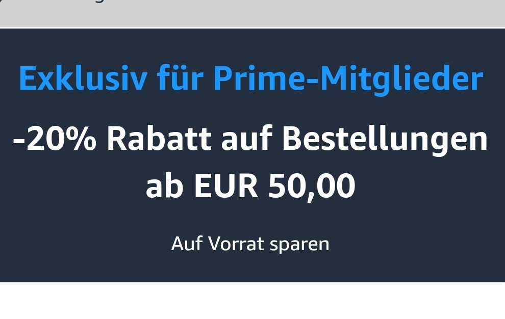 Seid ihr Prime-Mitglied? Wenn nicht, dann einfach mal ausprobieren, denn Prime-Mitglieder Mitglieder bekommen gerade exklusiv 20% Rabatt auf Einkäufe ab 50€.