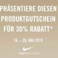 Ihr bekommt unter dem Link einen Gutschein für 30% Rabatt in allen Nike Factory Stores. Zeigt den Gutschein ausgedruckt vor um den Rabatt zu erhalten.
