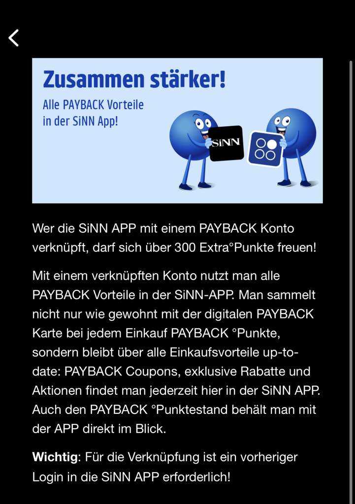 Aktionszeitraum: 1.06.-31.07.2023. Die Gutschrift der 300 Extra °Punkte erfolgt bei erstmaliger Verknüpfung der SiNN App mit PAYBACK ca. 2 Wochen nach Ende des Aktionszeitraums. Voraussetzung ist die erfolgreiche Freischaltung der PAYBACK Services inkl. Erteilung des Marketing-Einverständnisses gegenüber SiNN.