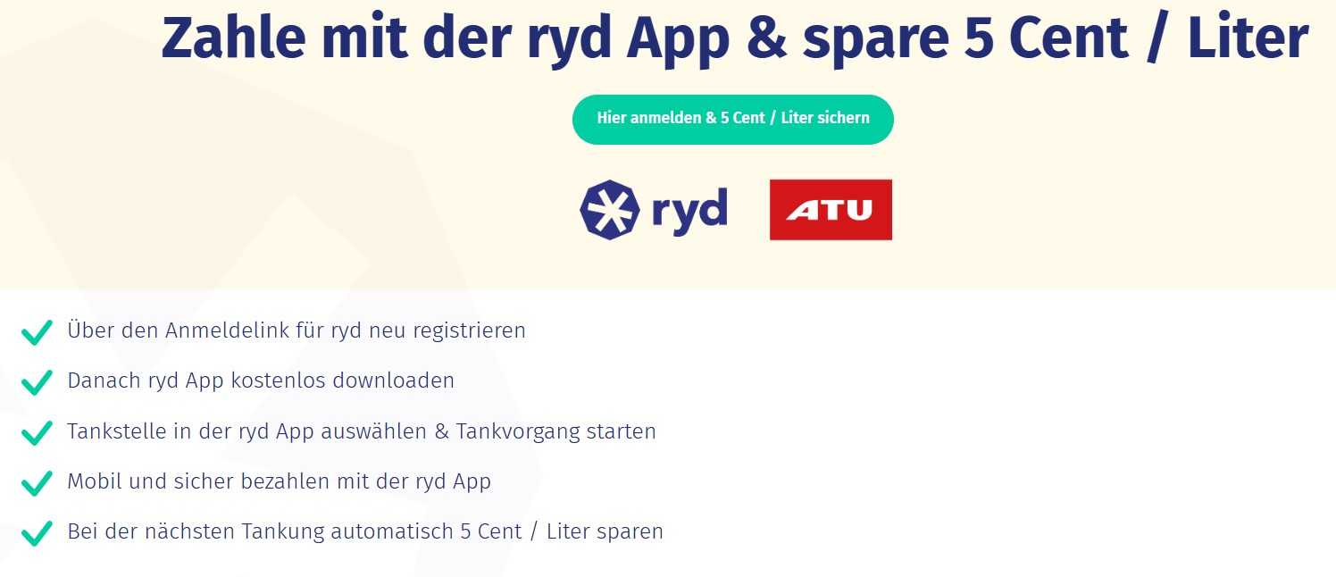 Teilnahmeberechtigt sind alle ryd pay Kund:innen, die sich über den von ATU zur Verfügung gestellten Anmelde-Link ryd.one/de/atu mit einem noch nie für ryd genutzten Zahlungsmittel für ryd pay neu registrieren oder sich in der Vergangenheit über den vorgenannten Link registriert haben und im Aktionszeitraum (16.05.2023 bis einschließlich 30.06.2023) einen Tankvorgang mit ryd pay ausführen. Sie erhalten einmalig einen Tankrabatt im Wert von 5 Cent pro Liter, über maximal 100 Liter, für ihre erste Zahlung im Aktionszeitraum mit ryd pay, einlösbar an jeder Tankstelle im ryd Netzwerk in Deutschland. Der Gutschein wird automatisch aktiviert und wird für den Kunden unsichtbar im Account hinterlegt. Er wird unmittelbar beim nächsten Tankvorgang mit ryd verrechnet und ist auf der Tankrechnung ersichtlich. Nicht auf mehrere Tankvorgänge aufteilbar. Umtausch, Übertragung oder Barauszahlung sind ausgeschlossen.