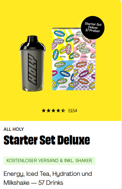 • HOLY Energy (14 Drinks, 7 Sorten), Iced Tea (14 Drinks, 7 Sorten), Hydration (14 Drinks, 7 Sorten) & Milkshake (15 Drinks, 5 Sorten)