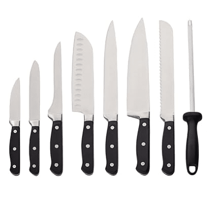 - 9-teiliges Set: (1) 20,3 cm Kochmesser, (1) 17,8 cm Santokumesser, (1) 20,3 cm Schälmesser, (1) 20,3 cm Brotmesser, (1) 12,7 cm Allzweckmesser, (1) 9 cm Schälmesser, (1) 20,3 cm Spitzer, (1) Messerblock