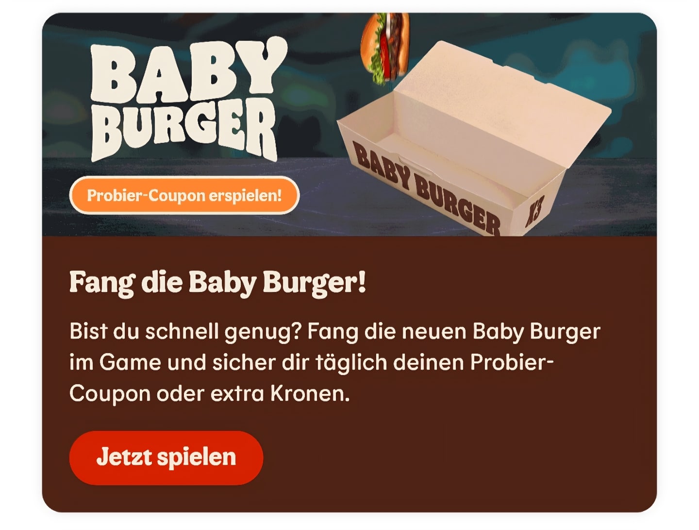 Ab einer Punktezahl von 40 Punkten erhält man einen Probier-Coupon für den Baby Burger. Dieser wird automatisch in die Couponauswahl des jeweiligen Benutzerkontos zugefügt.