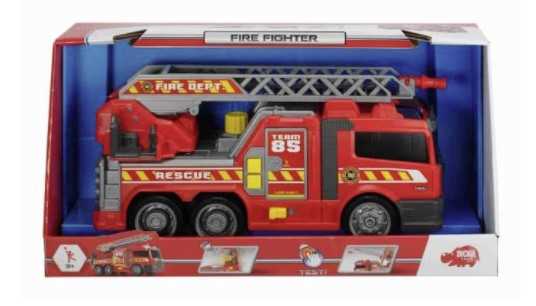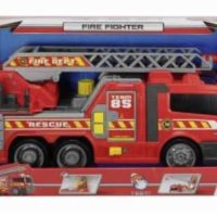 Mit dem Feuerwehrfahrzeug Brände in der Spielzeugstadt löschenDas Feuerwehrfahrzeug aus der Large Action-Serie von Dickie Toys ist ein wahrer Blickfang und lässt die Augen von kleinen Feuerwehr-Fans leuchten. Das Fahrzeug hat eine Größe von ca. 36 cm und verfügt über eine manuelle Wasserpumpe sowie ein Seitenpanel, welches geöffnet werden kann. Hinter dem Seitenpanel verbergen sich typische Bauteile, die eine Feuerwehr bei einem Einsatz benötigt. So erhalten die kleinen Feuerwehr-Fans einen Einblick in die Funktionsweise eines Einsatzfahrzeugs.Das authentische Spielerlebnis wird durch stilechte Licht- und Soundeffekte abgerundet. Ein ideales Spielzeug für alle Kinder ab 3 Jahren!Weitere Informationen zum Feuerwehrfahrzeug