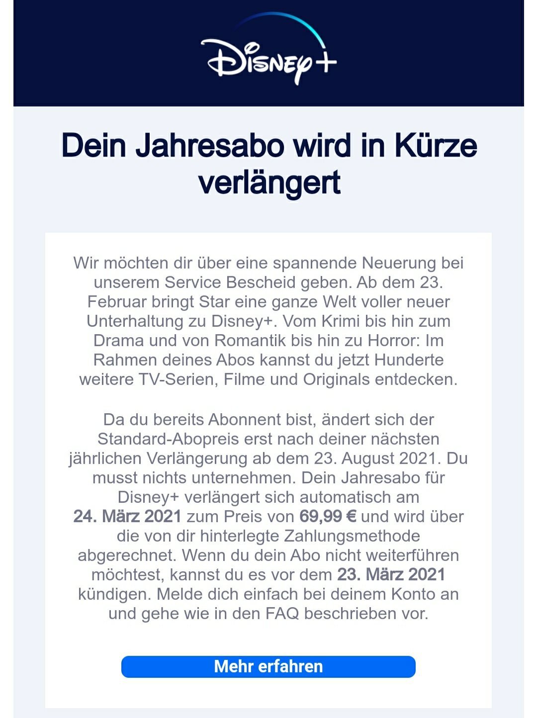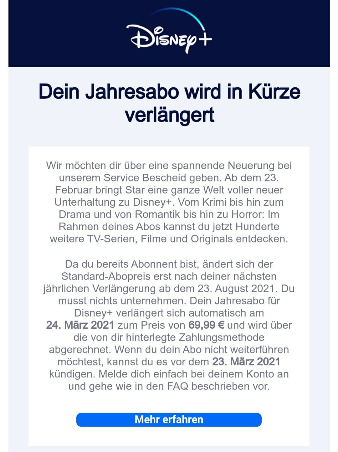Update Einige User berichten, dass Disney aktuell Mails verschickt, mit der Ankündigung, dass Bestandskunden auch in 2021 noch zum alten Tarif von 69,99€ streamen können. Erst ab 2022 trifft die Preiserhöhung auf Bestandskunden zu. Wenn ihr Disney auch in 2022 für 69,99€ weiter nutzen möchtet, dann ist es wohl möglich, bereits für 2022 vorzukaufen, da der Abo-Gutschein nicht verfällt. Danke @ObiWanKenobi @OldChatterhand @PapaSchlumpf für die Infos! 👍🏻🔝