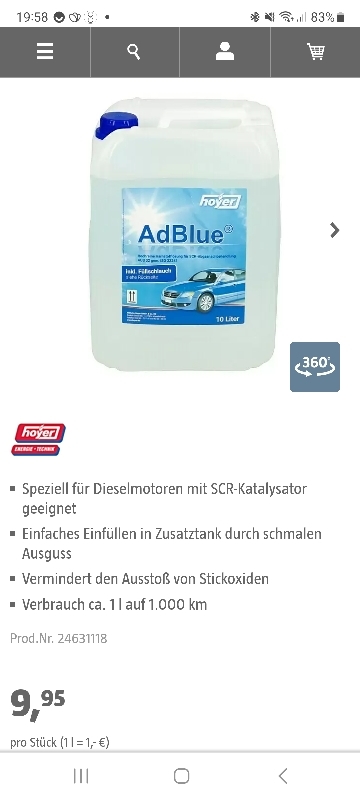 Einige Dieselfahrer brauchen AdBlue. Wer dazu gehört, kann bei Amazon jetzt ein wenig sparen. Dort gibt es 2x Hoyer AdBlue 2x10l SCR Harnstofflösung Diesel ISO 22241 (Mindestbestellmenge) für nur 19,90€