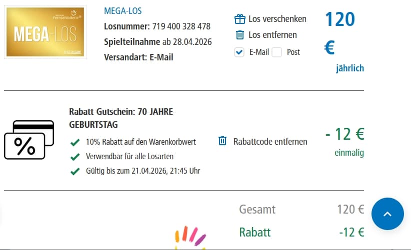 Das lohnt sich besonders bei Jahreslosen bzw. bei jährlicher Zahlung. Also darauf achten, dass jährliche Zahlung bspw. beim Mega-Los vor dem Checkout angewählt ist.