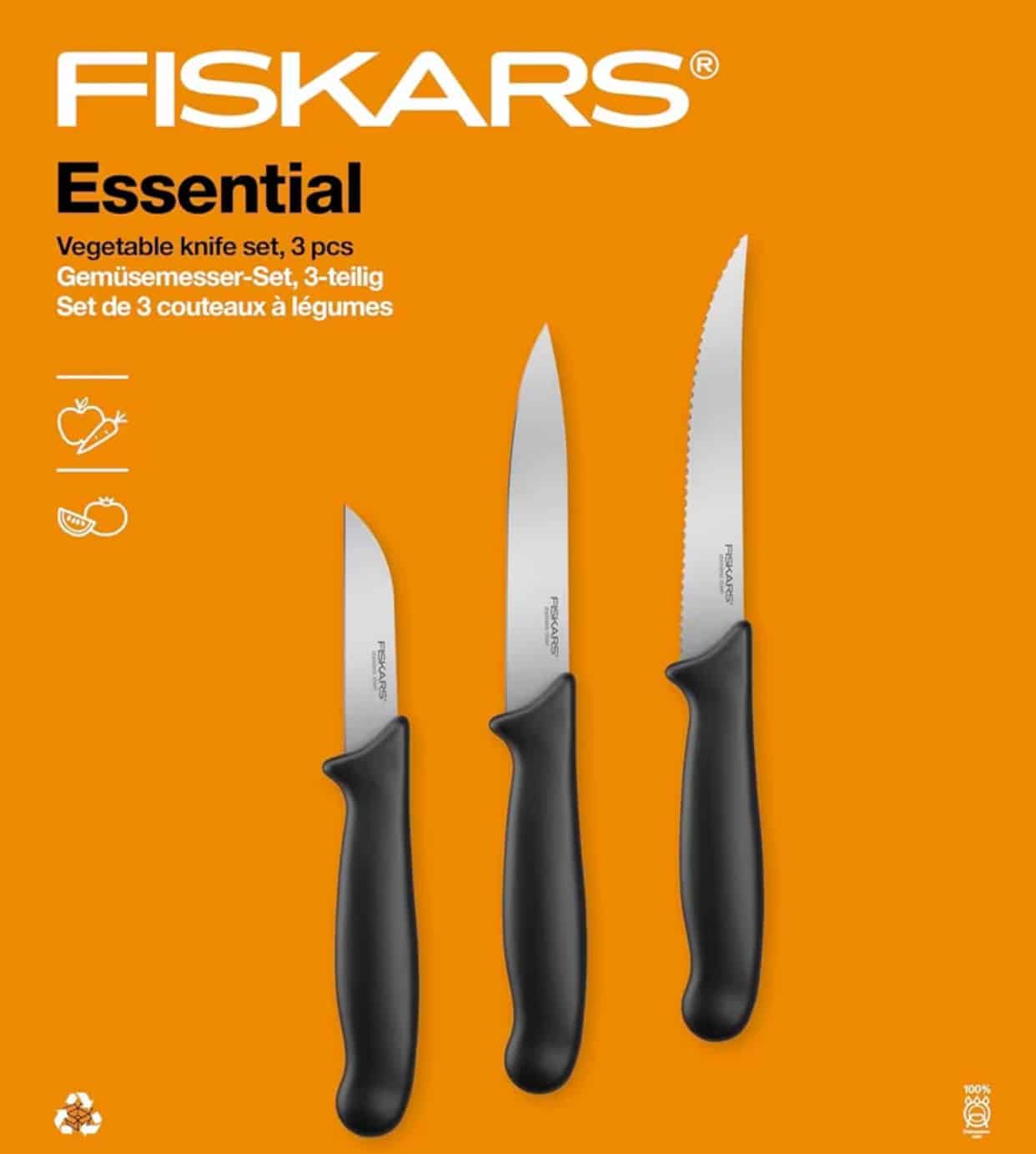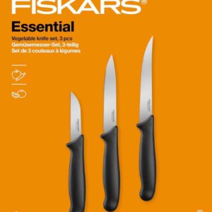3-teiliges Gemüsemesser-Set mit Schälmesser, Gemüsemesser und Tomatenmesser, Ideal zum Schneiden und Schälen von Gemüse und Obst Robuste, langlebige Griffe aus PP-Kunststoff mit großem Fingeranschlag für sicheres Schneiden Hohe Schneidkraft dank scharfer Klingen aus rostfreiem japanischem Stahl mit lang anhaltender Schärfe Hohe Langlebigkeit, Leichtes Reinigen, Spülmaschinengeeignet, Spülen von Hand empfohlen für lang anhaltende Schärfe, Produktverpackung enthält 90% weniger Plastik im Vergleich zum Vorgängermodell Lieferumfang: 1x Fiskars Gemüsemesser-Set, Essential, 3-teilig, Schälmesser, Gemüsemesser, Tomatenmesser, Edelstahl / PP-Kunststoff, Schwarz,