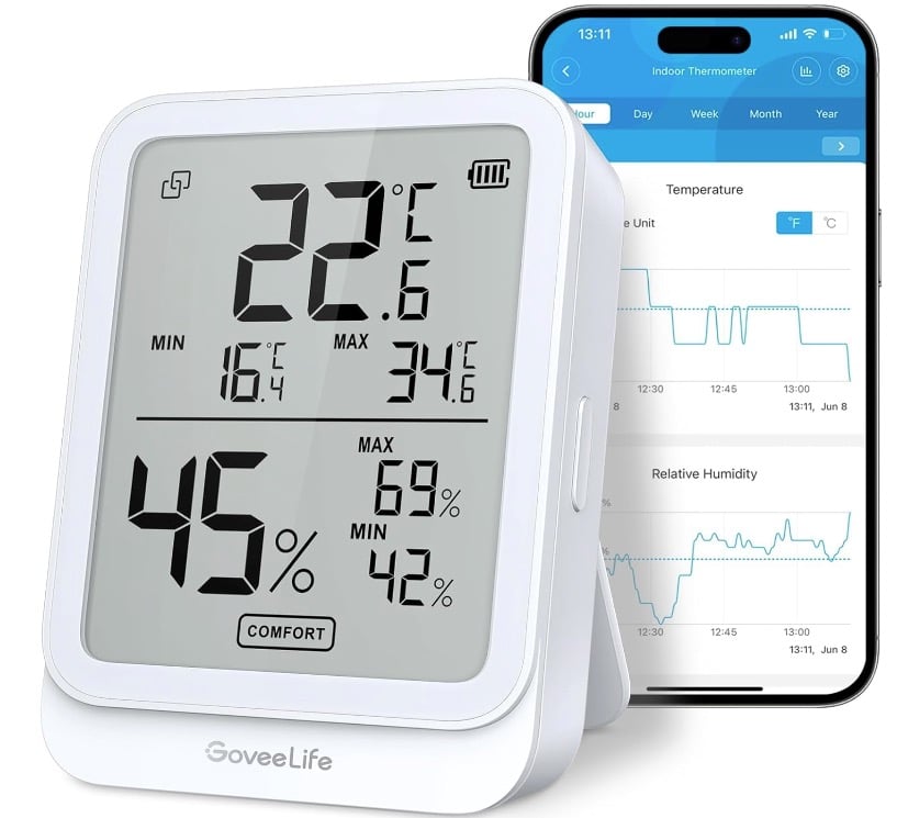 - Größeres LCD-Display: Das Goveelife-Temperatur- und Feuchtigkeitsmessgerät zeigt Echtzeit-Hoch-/Tiefstwerte auf einem größeren Bildschirm an. Es gibt auch eine 3-stufige Komfortanzeige: Dry / Comfort / Wet.