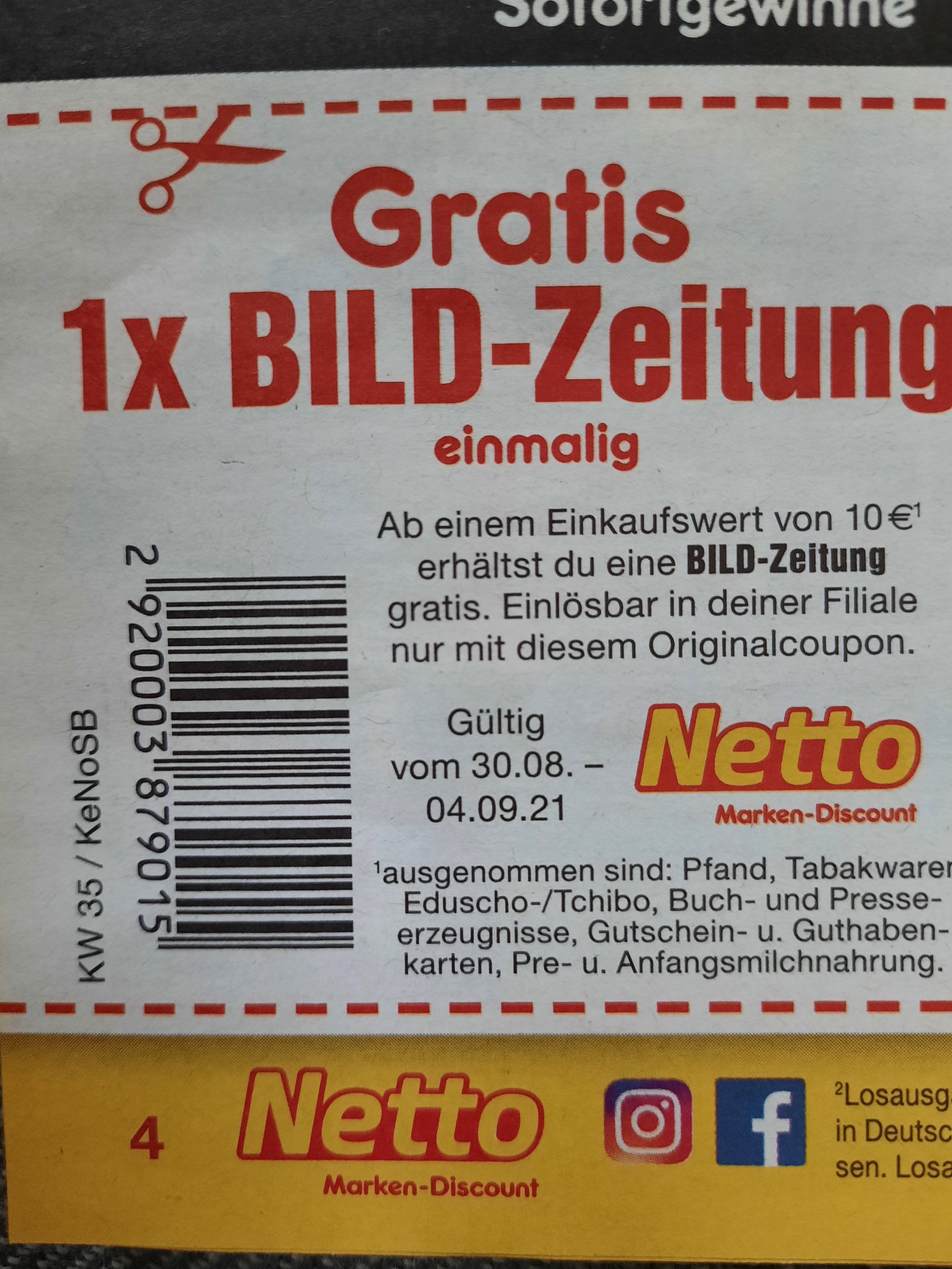 Vom 30.08. bis 04.09. erhaltet ihr bei Netto eine Bild-Zeitung gratis, wenn ihr für mindestens 10 € dort einkauft .