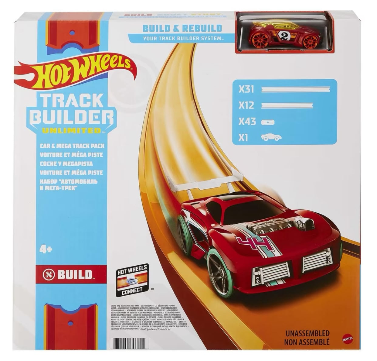 Tolles Pack mit vielen Trackteilen und Verbindungsstücken sowie einem Hot-Wheels-Fahrzeug, das die Freude an individueller Gestaltung, Fantasie und am Bauen weckt!