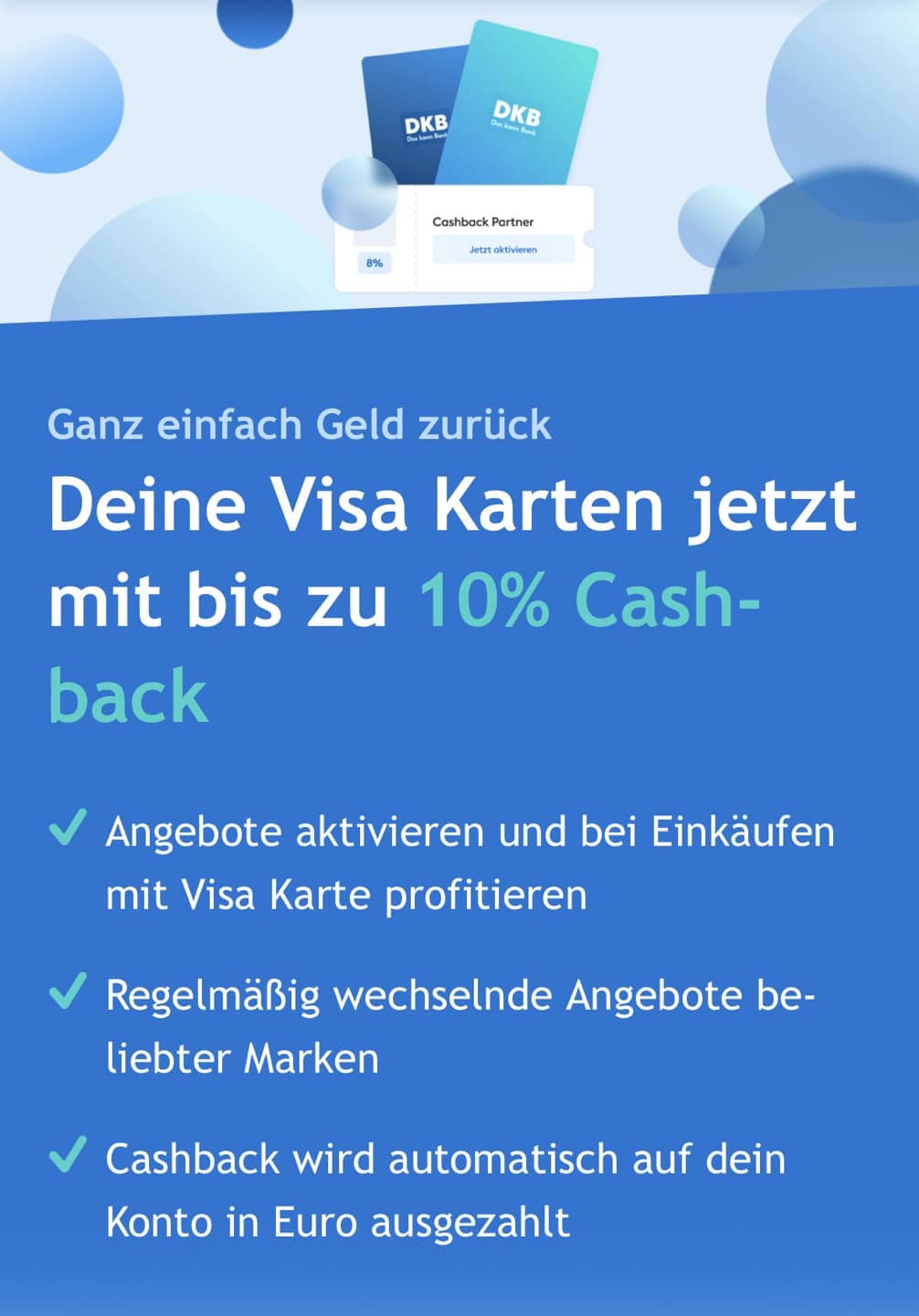 Aktiviere Angebote direkt in der DKB-App und erhalte bis zu 10% Cashback, wenn du mit deiner Visa Debitkarte oder Visa Kreditkarte bezahlst.