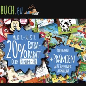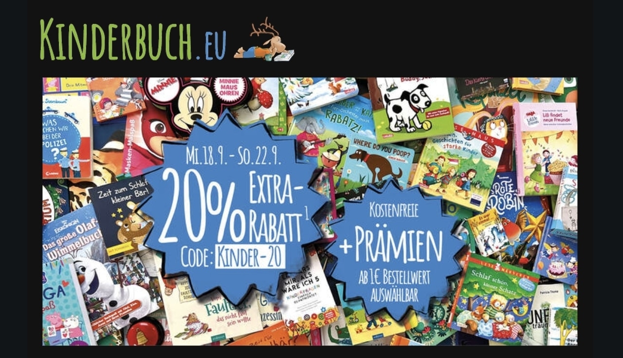Bei Kinderbuch.eu gibt es noch bis Sonntag 20% Extra-Rabatt sowie eine kostenlose Prämie zum Weltkindertag.