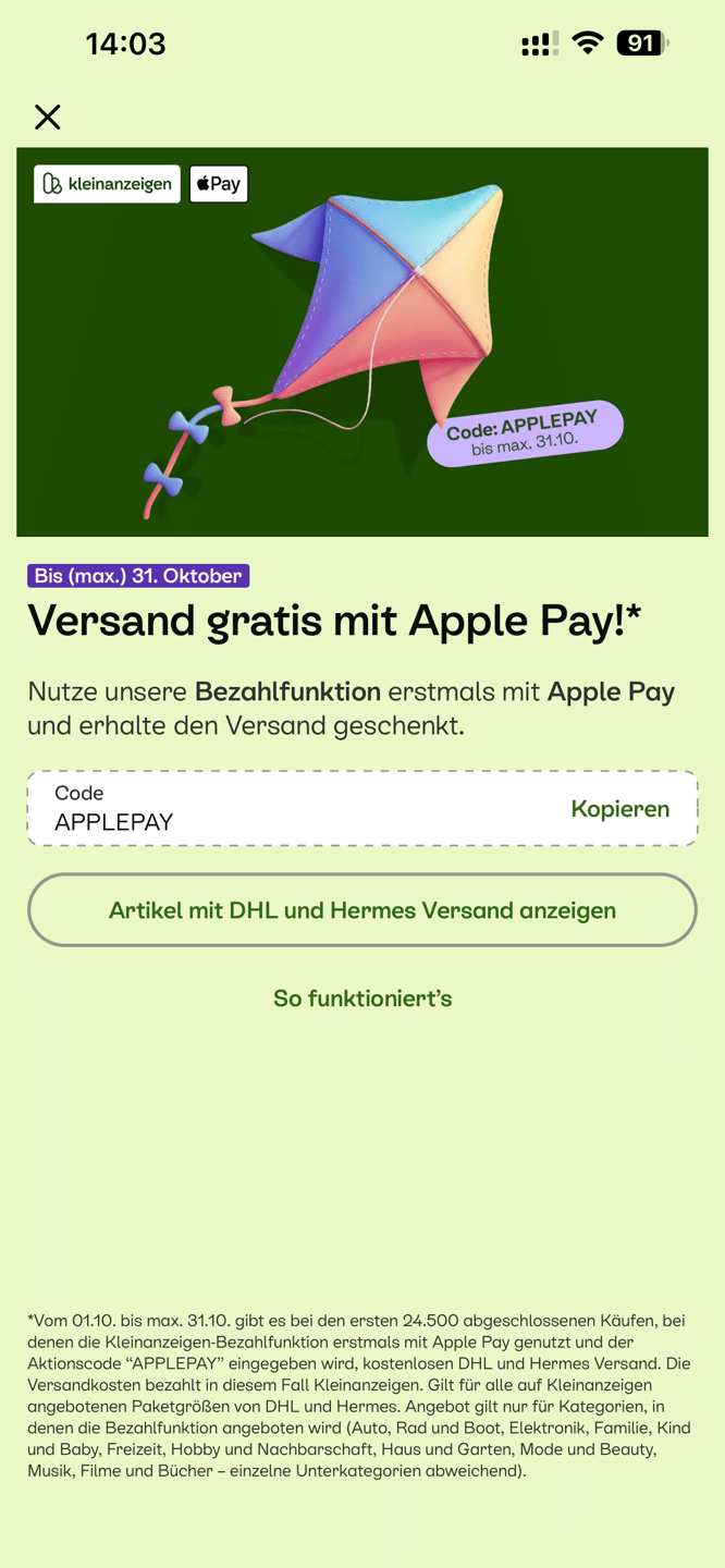Bei erstmaliger Nutzung der Bezahlfunktion mit Apple Pay gibt es bei Kleinanzeigen kostenlosen Versand. Nutzt hierfür den Code APPLEPAY.