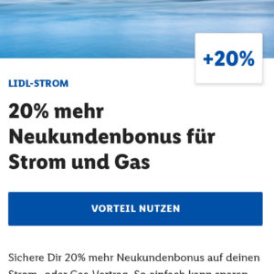 Auf der suche nach einem richtig krassen Tarif zum Abschluss eines neuen Stromtarifes, habe ich in der Lidl Plus App gesehen, 20% Bonus für Neukunden. Also mal vorrechnen lassen, und siehe da gibt noch on-top ein Einkaufsgutschein und der eff. Preis anhand meiner PLZ hat mich überzeugt.