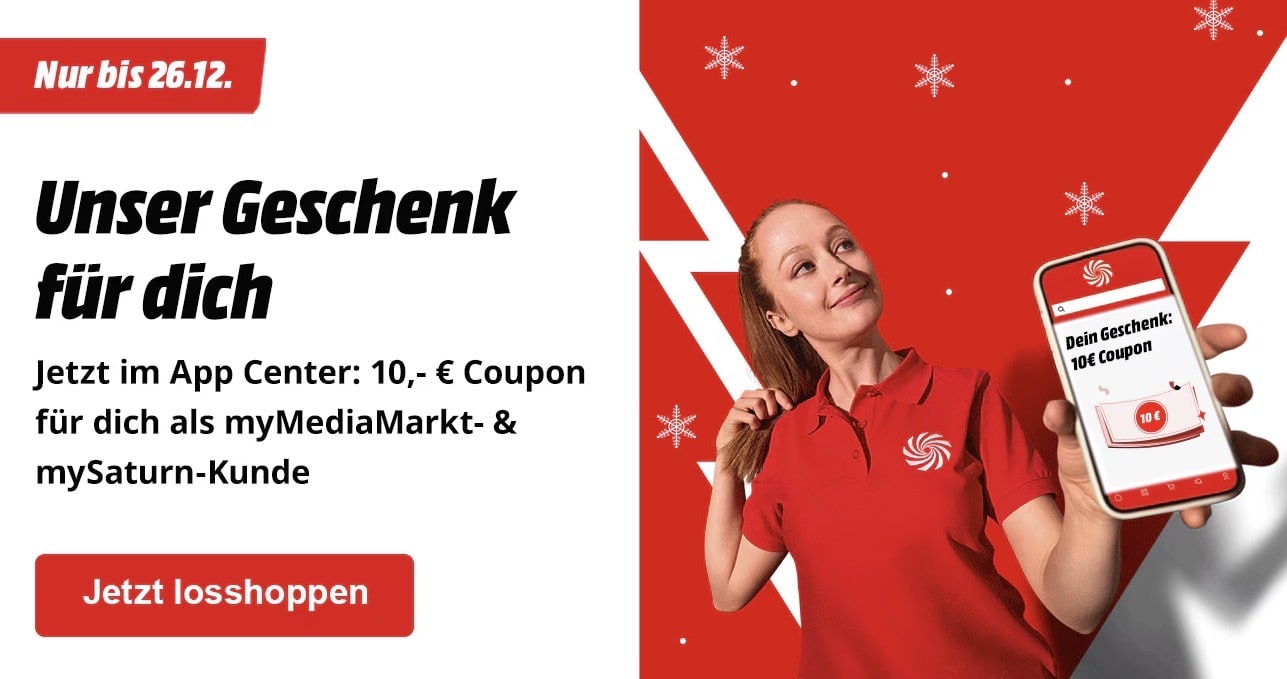 Nur bis 26.12.25 gibt es bei Mediamarkt/Saturn in der App einen 10€ App Coupon ab 100€ Einkaufswert (bis zu 10% Rabatt).