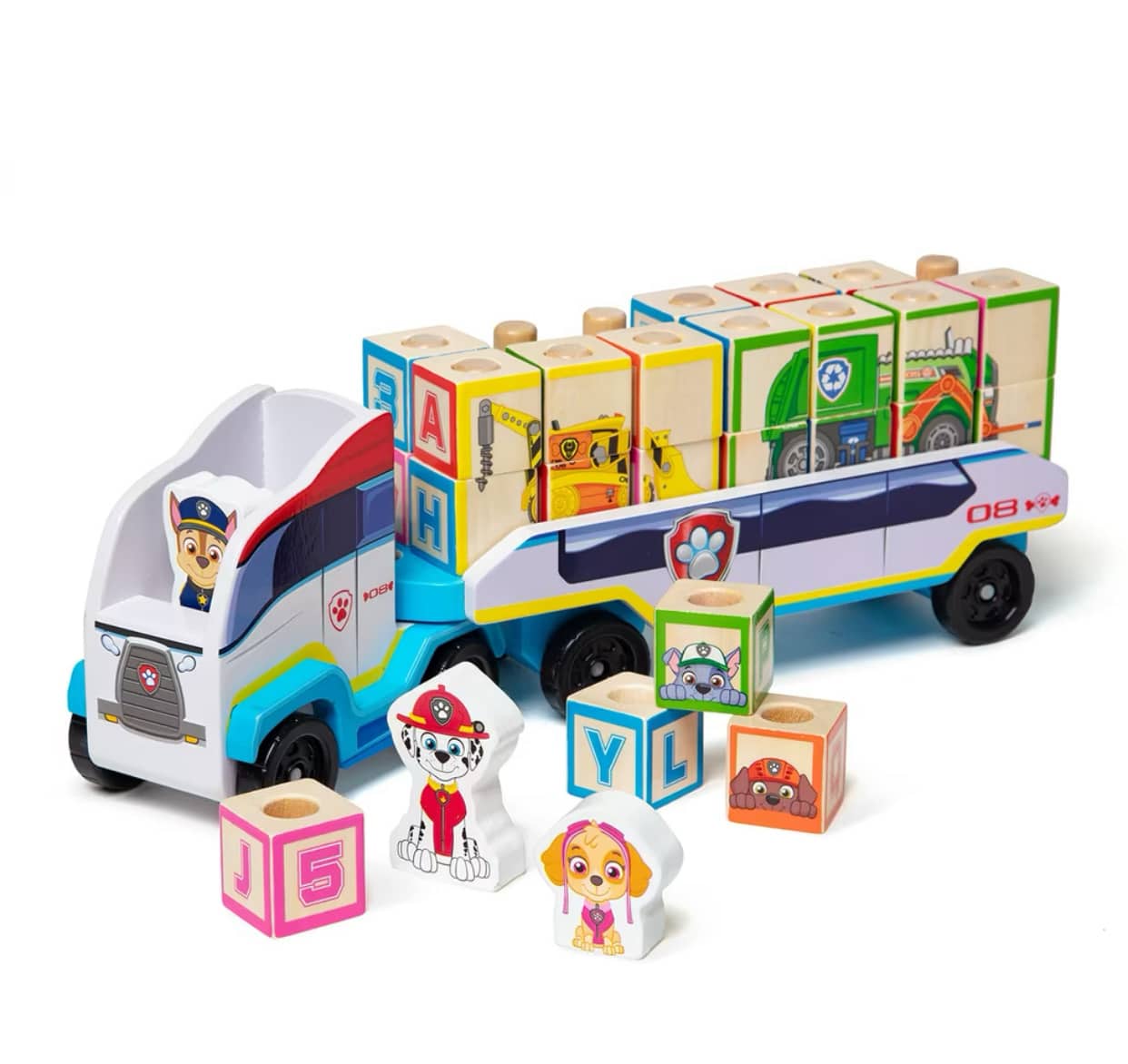 PAW Patrol ist mit diesem Riesen-Lkw aus Holz mit Anhänger auf Achse, der 28 Klötze zum frühzeitigen Lernen transportieren kann.