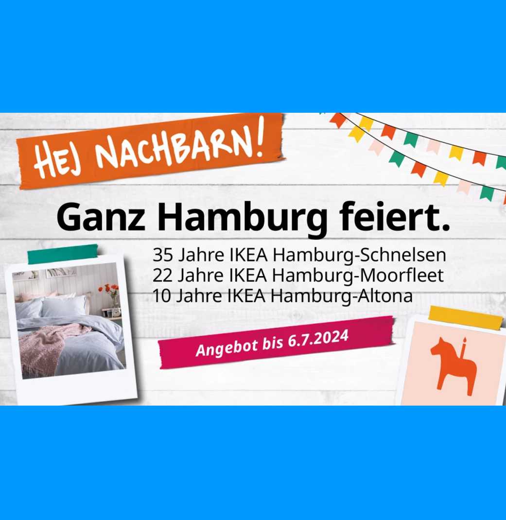 IKEA in Hamburg feiert von Juni bis August 2024 das Bestehen aller drei Filialen in der Stadt: Hamburg-Schnelsen wird 35, Hamburg-Moorfleet 22 und das Mini-IKEA in Hamburg-Altona in der Fußgängerzone 10 Jahre alt.