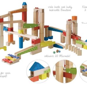 - MIT DEN IM 100-TEILIGEN KUGELBAHN BAUSATZ enthaltenen 20 Glasmurmeln und 80 Bausteinen kann der Murmelspaß beginnen. Bunte und naturbelassene Bausteine aus Holz lassen sich geschickt kombinieren.
