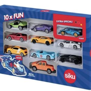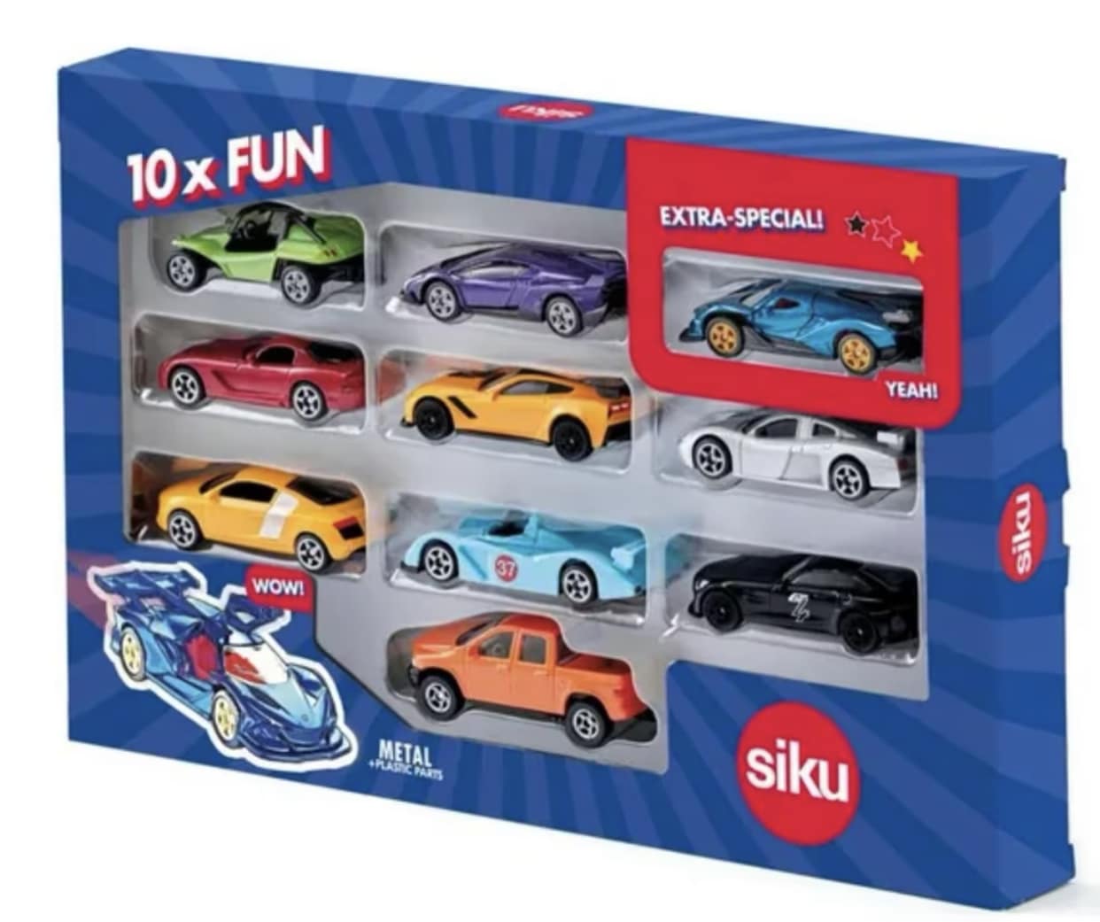 Mit dem 10er Set von siku können Kinder ihre eigene kleine Flotte von Fahrzeugen aufbauen und spannende Abenteuer erleben. Dieses Set enthält eine vielfältige Auswahl an hochwertigen siku Modellautos, die für stundenlangen Spaß und spannende Abenteuer sorgen. Ob auf der Rennstrecke, im Kinderzimmer oder draußen im Garten – die Möglichkeiten für fantasievolles Spielen sind grenzenlos. Das neue siku Set enthält 10 Fahrzeuge in bekannter siku Qualität für Kinder und Sammler. Enthalten sind unter anderem: Ein Audi R8, eine Chevrolet Corvette ZR1, ein Lamborghini Veneno, ein Mercedes-AMG GT4, eine Dodge Viper und ein Apollo IE.
