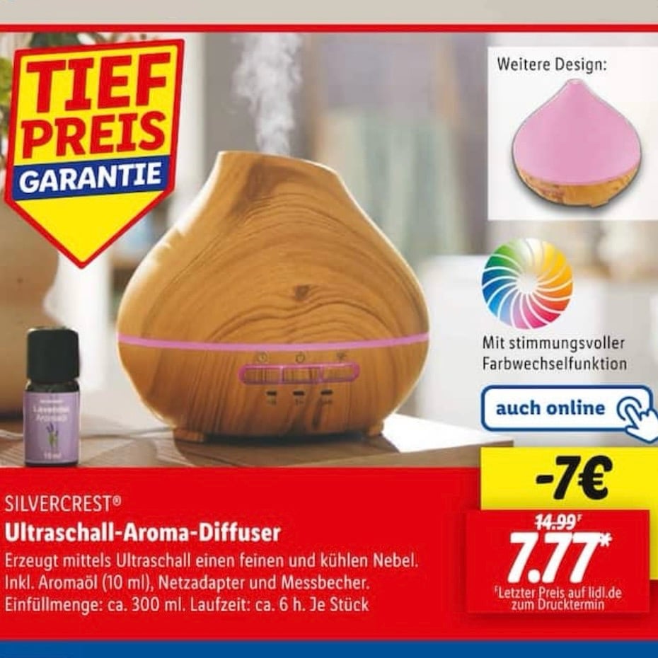 Der SILVERCREST® Aroma-Diffuser verwandelt dein Wohnzimmer in eine duftende Wohlfühloase – per Ultraschall-Technologie wird ein feiner, kühler Nebel erzeugt, der deine Lieblingsdüfte im Raum verteilt. 🌬️🌿