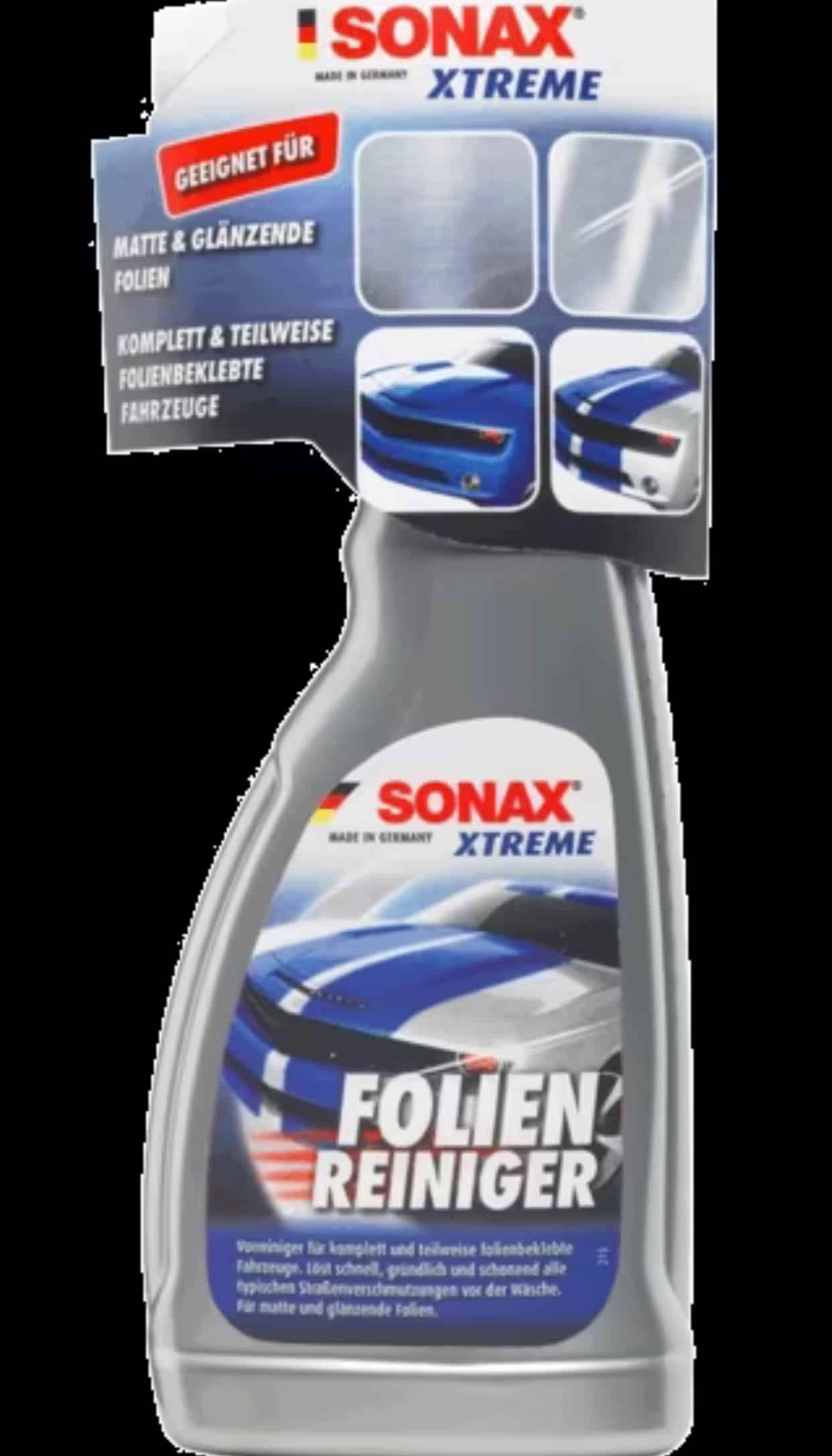• Öl, Fett, Ruß und Insektenreste entfernt der Sonax Xtreme Folienreiniger besonders materialschonend. Dabei ist es egal ob die Oberfläche ganz oder nur teilweise foliert ist.