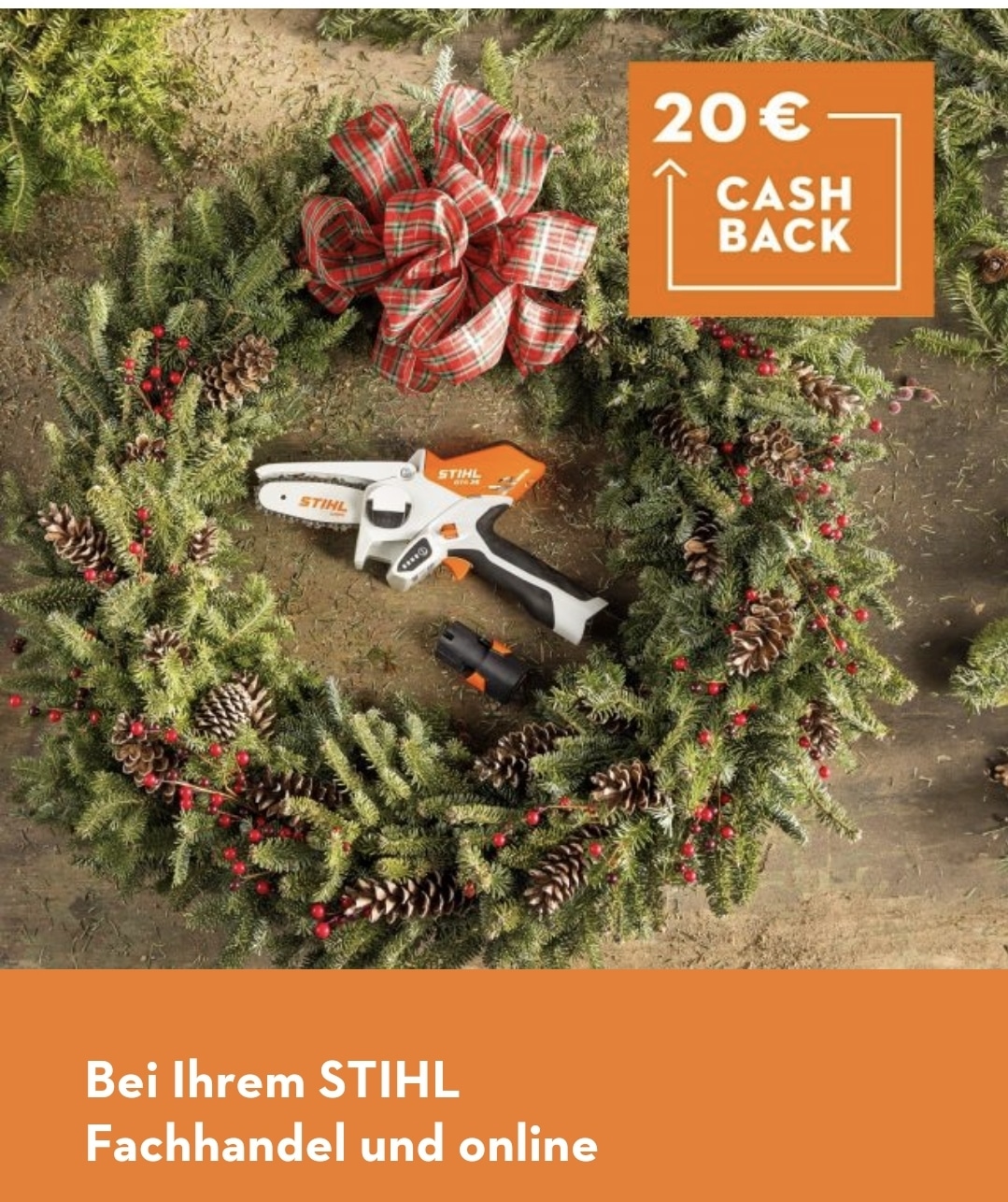 Wer sich bis zum bis 24.12.2024 eins der ausgewählten Geräte und Sets aus dem STIHL Akku AS-System zulegen möchte, kann sich über 20 € Cashback freuen.