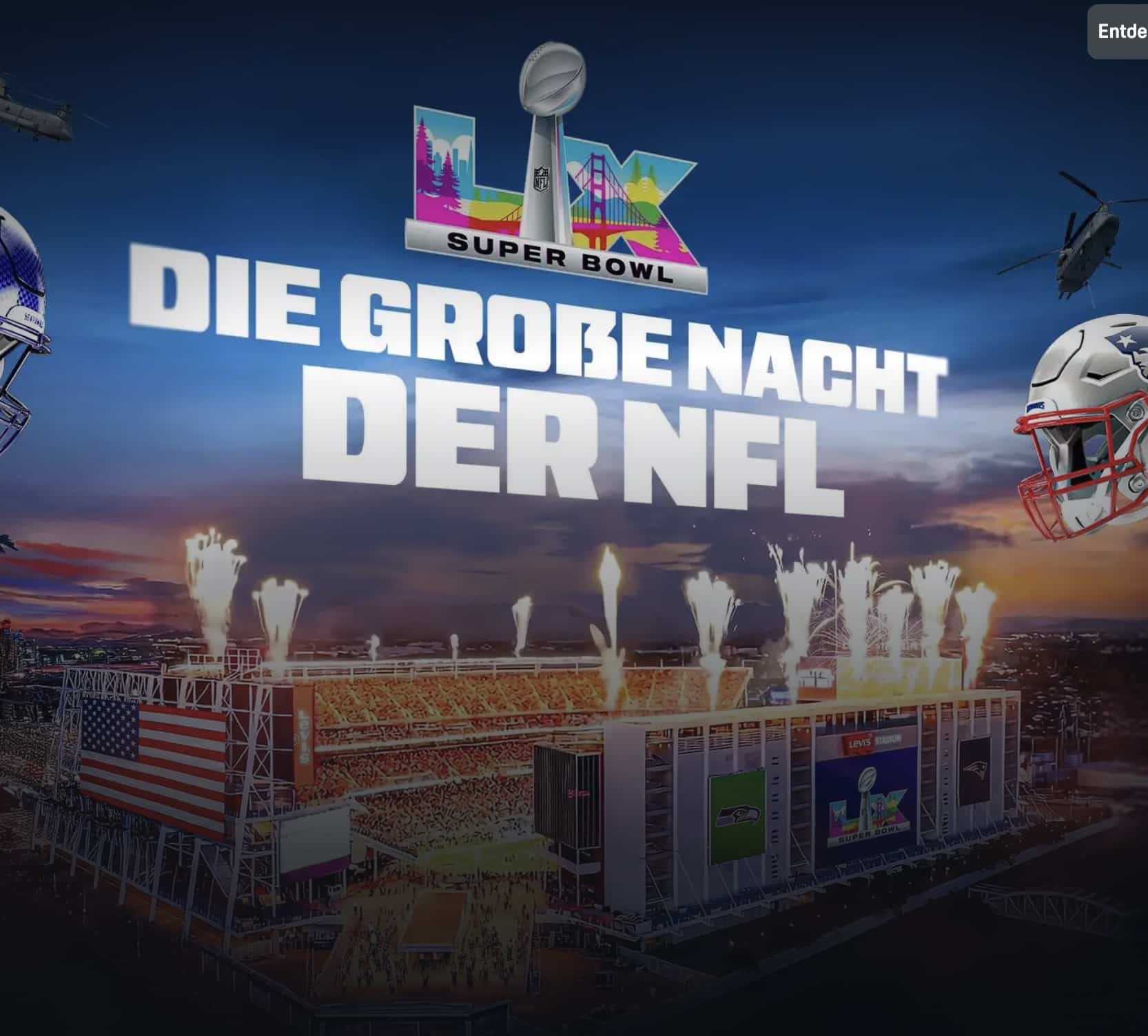 - Schaue den Super Bowl LX, Vorberichte, Zusammenfassungen und Shows, inklusive Hard Knocks, NFL Network, NFL Films und vieles mehr.