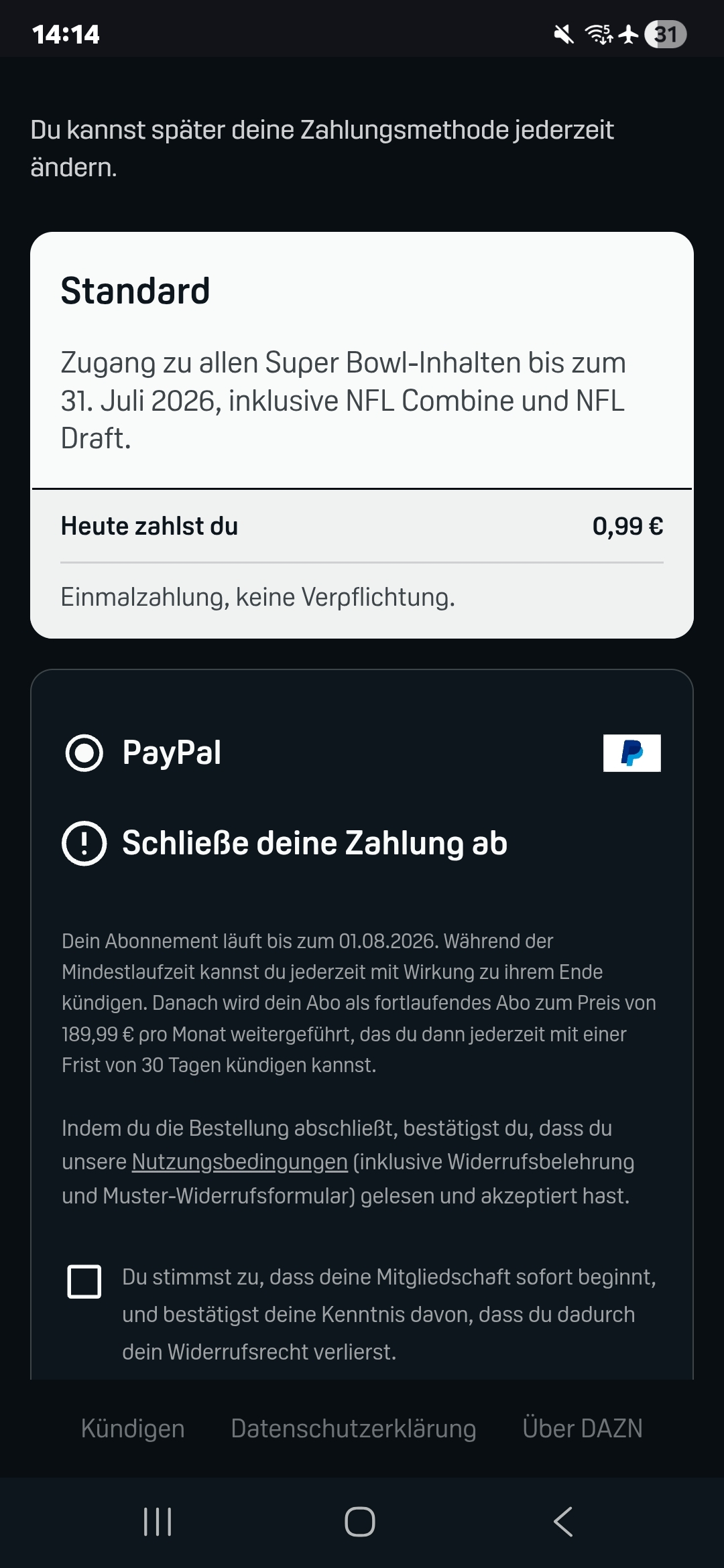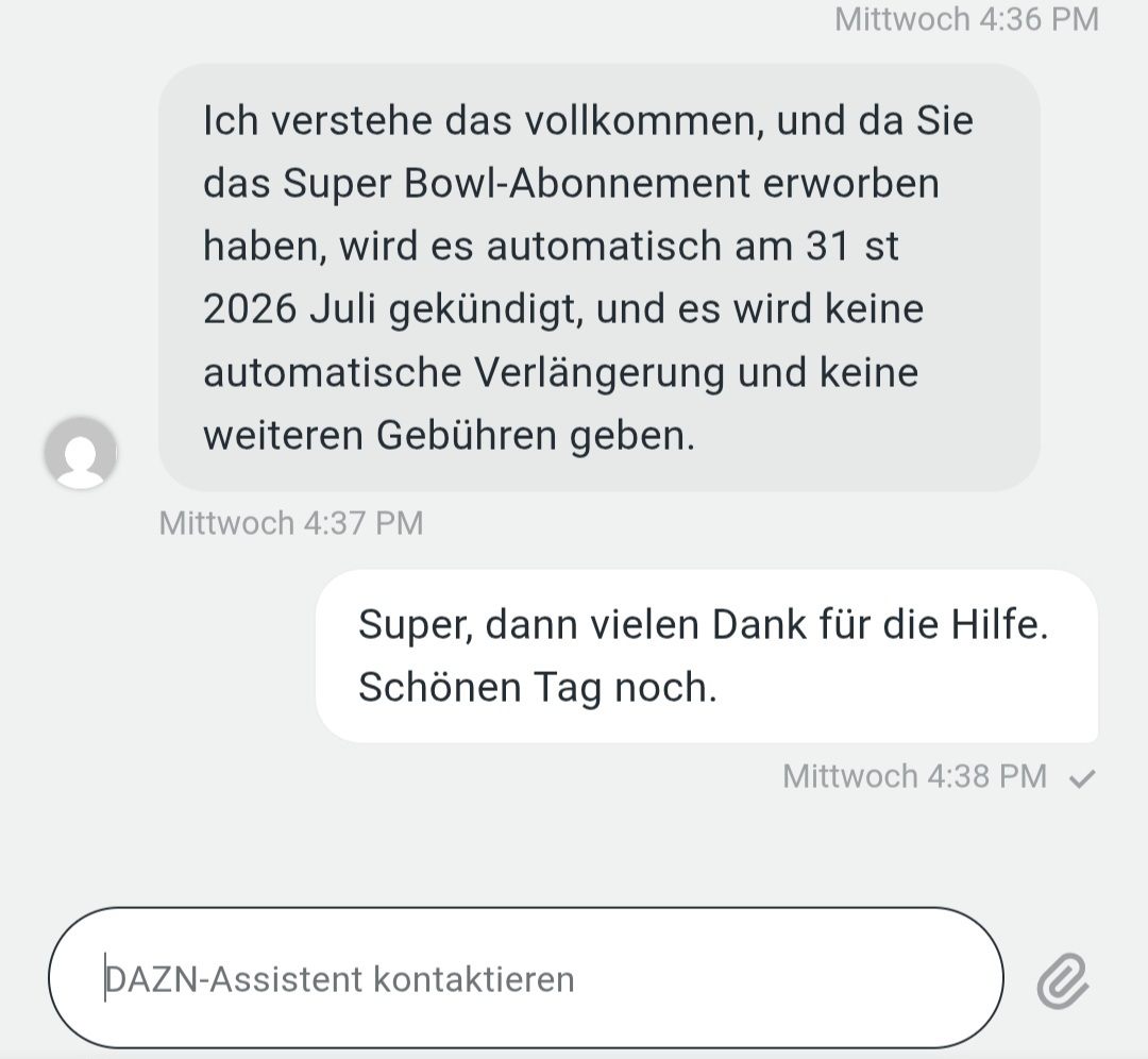 Oben steht Einmalzahlung unten was von Abo. Total EINDEUTIG, dafür ist DAZN ja bekannt. Ne Option zum kündigen finde ich nicht. Also werde ich wohl mal den Support bemühen um EIGENTLICH EINDEUTIG SICHER zu sein.