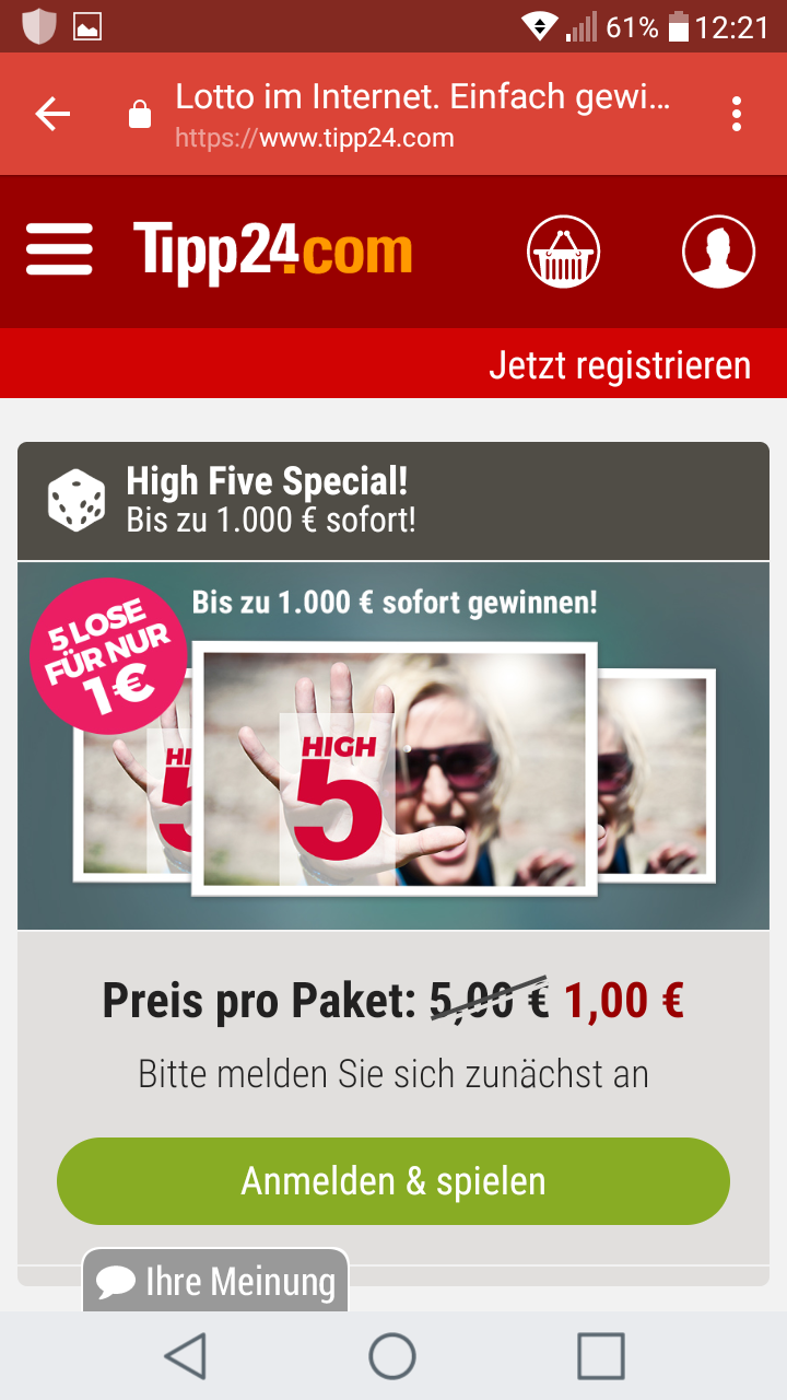 Habe gerade Newsletter von Tipp24 bekommen und gleich mitgemacht. 5 High Five Rubbellose für nur 1€ statt 5€ ist ein Superpreis. Hat bei mir nicht wirklich gelohnt mit nur €0,75 Gewinn effektiv €0,25 verloren. Dafür aber bei meiner Frau 2x €0,50 + 1x €0,75 = €1,75 macht €0,75 Gewinn. Also insgesammt bei €2 Einsatz €2,50 wieder reingeholt – nicht viel, aber immerhin für lau.